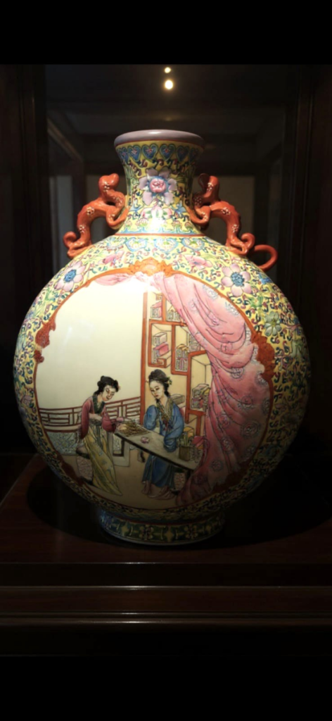 中央開光仕女圖如幽影穿越時光,二位仕女端坐室內,神態閒雅,衣紋層層疊疊,粉彩柔和分明,如晨霧幻境。室內布置與庭園景致相映成趣,畫面深邃隱秘,人物與花卉精工雕琢,動態流轉、氣韻生動,呈現乾隆宮廷畫風華麗精緻的極致尊貴。瓶身纏枝花卉紋繁複錯落,粉紅、紫羅蘭與翠綠交錯,層層花瓣與金彩線條如光影閃爍,似低語宮廷秘境,寓意吉祥。
